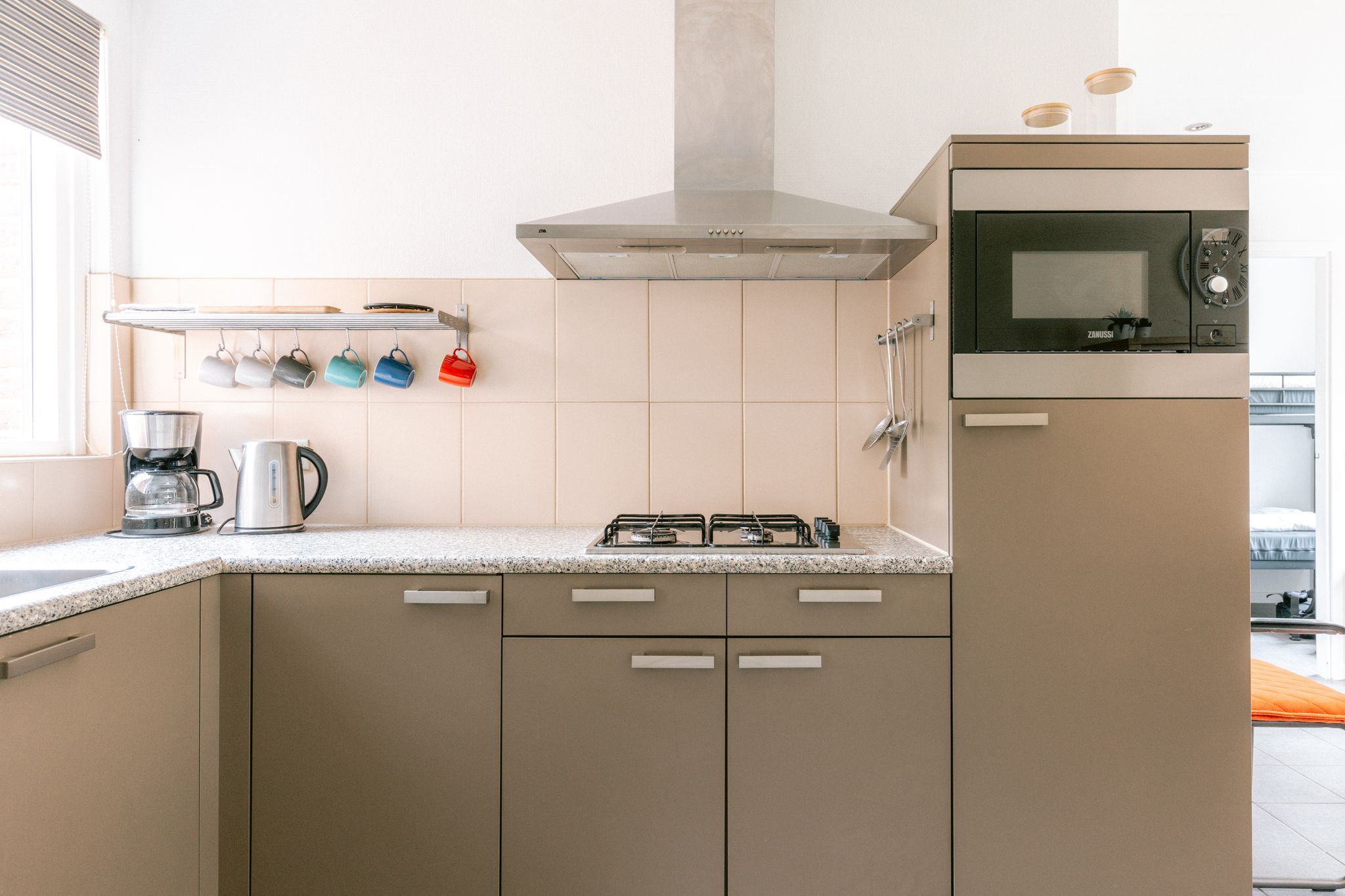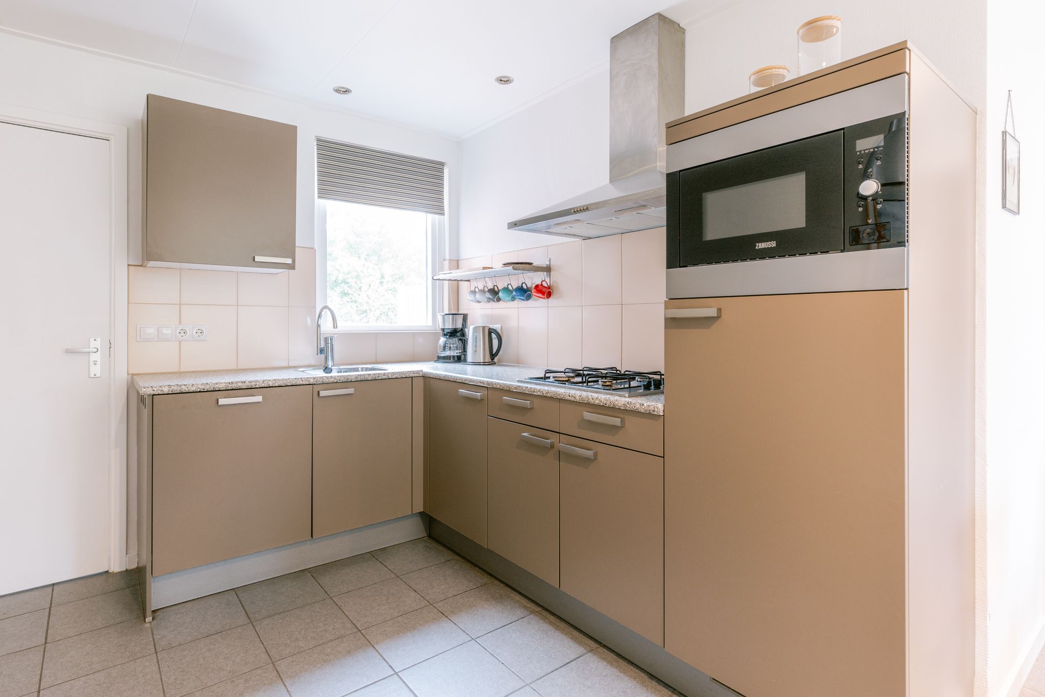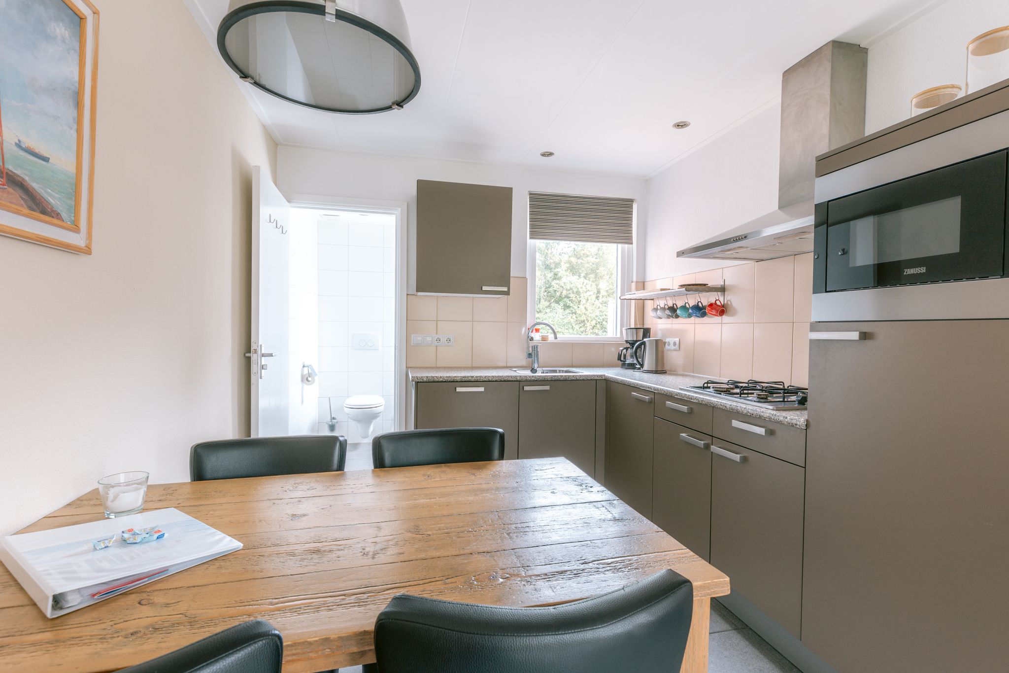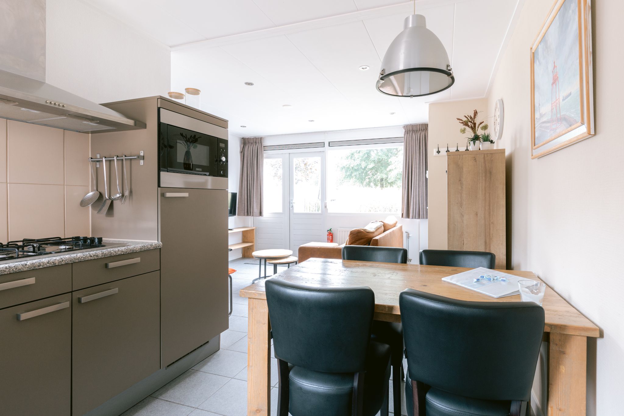 Woonkamer met open keuken. De keuken is ingericht met een koelkast met vriesvak, een vaatwasser, magnetron, filter-koffiezetapparaat, waterkoker en broodrooster.