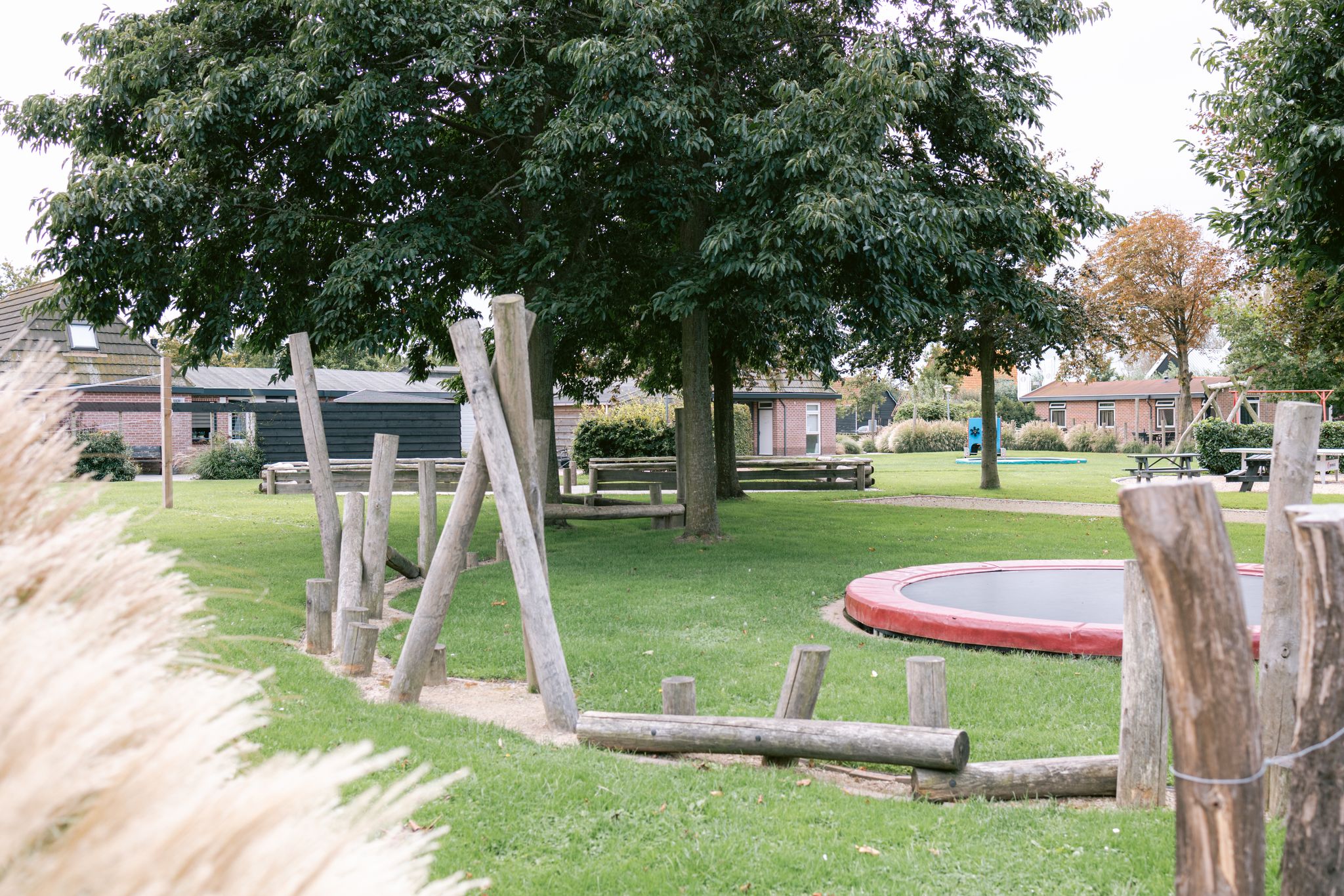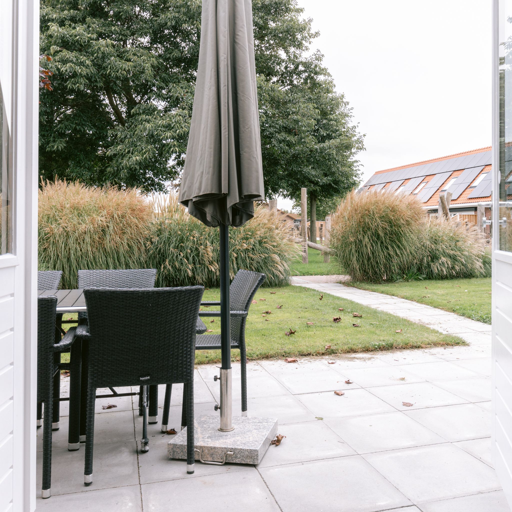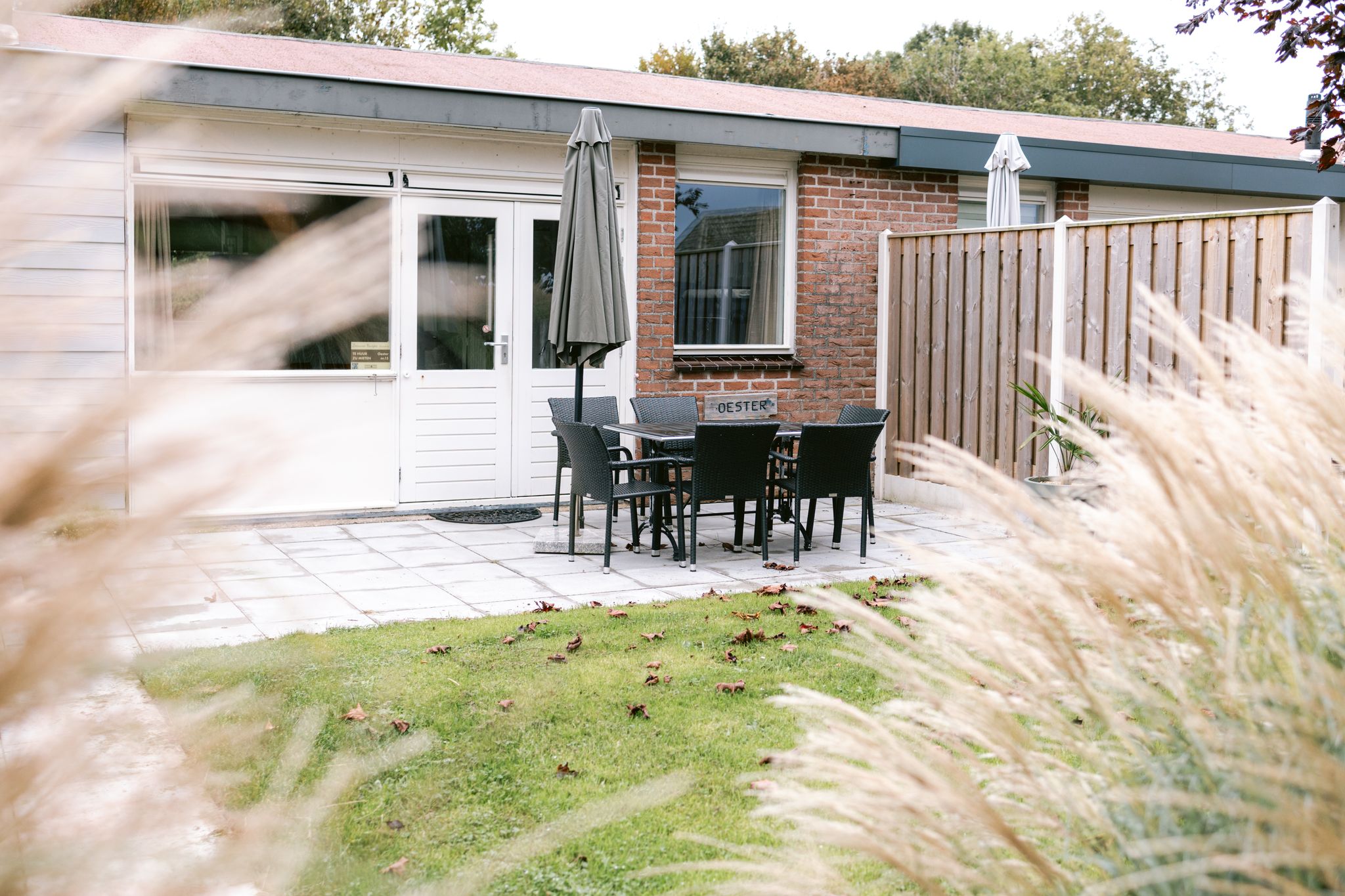 Terras met tuintafel, stoelen en parasol. Vanaf het terras kijk je uit over het speelveld.